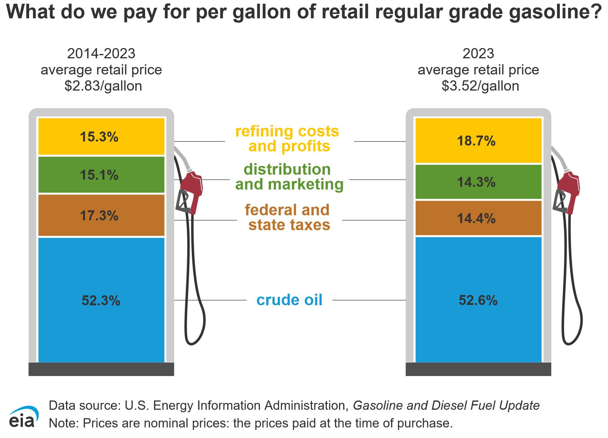 So, what goes into the price of gasoline at the pump? It is best depicted in the chart below which I retrieved from the EIA website(US Energy Information Administration) a source that I have referred to for decades. The chart information was last updated for data through 2023. As you can see, about 53% of the price of gasoline at the pump (on average) is derived from crude oil. So, for every $1 increase in crude oil prices, you can expect about 53 cents to flow to the pump. Government taxes are about 14% of costs, more so in the higher tax states and less so in others. Distribution and marketing, the down streamers, represent another 14%. Finally, the downstream adds close to 19% of your cost. However, the refining costs are heavily reliant on what is called the crack spread – the difference between crude oil and the end refined products – which can vary.